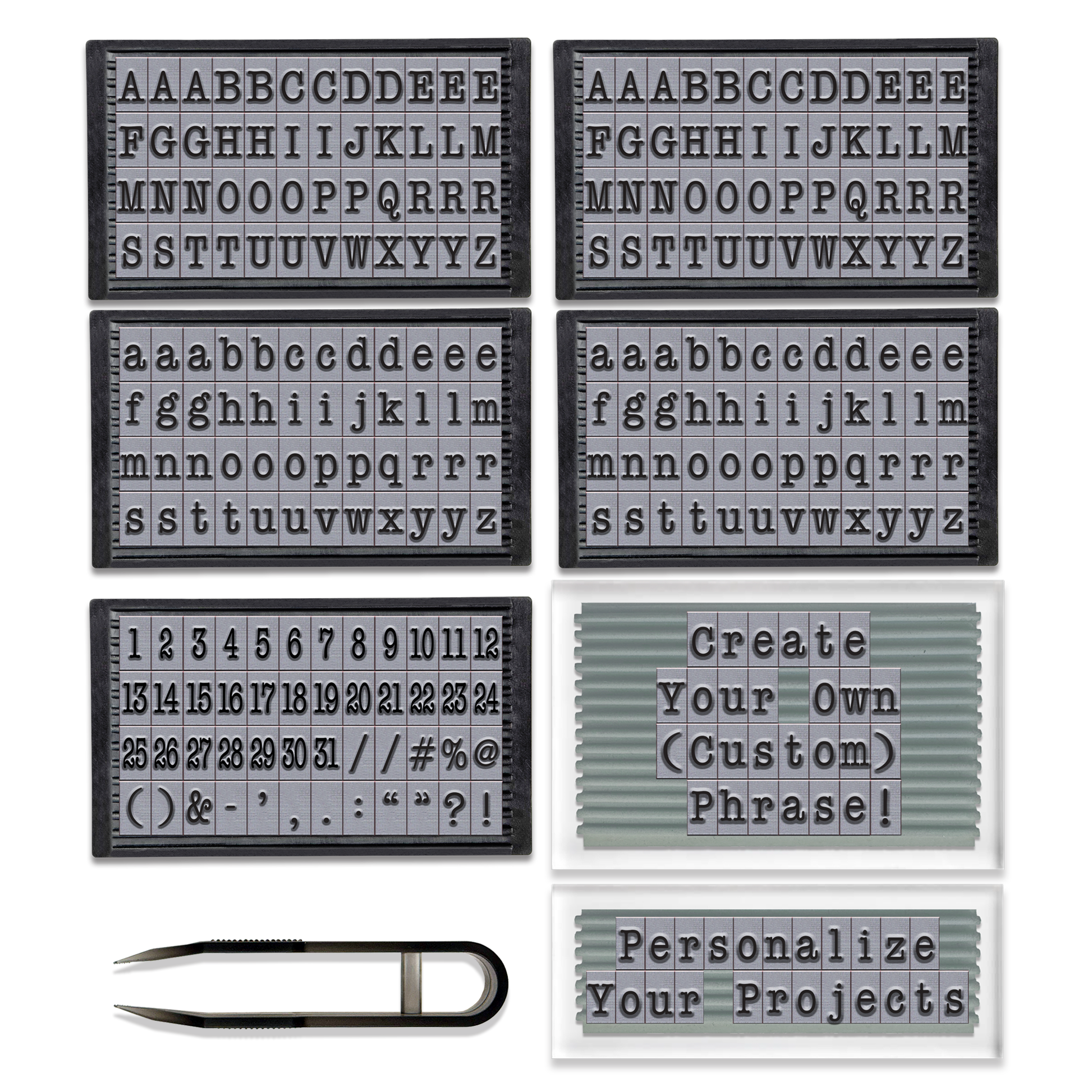 This revolutionary stamp set provides immediate versatility, flexibility and customization with every project. Included are 240 rubber stamp characters plus a 2x3" and a 1x3" grooved stamping tool. Use the 2" tall grooved stamp tool for custom phrases up to 5 lines. And use the 1" tall grooved stamp tool for 1 or 2-line custom words or messages. The repositionable/reusable polymer backing on the rubber stamp letter holders allows you the option to use your customized stamps with a stamping platform to easily create multiples of the same project.