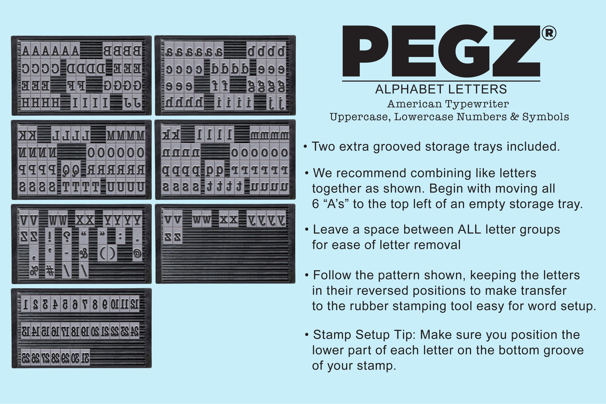 - Bundle set includes 96 Uppercase Letters, 96 Lowercase Letters, 48 Numbers & Symbols in 5 grooved storage trays. Plus 2 extra trays included for additional letter storage and a pair of tweezers for letter handling.